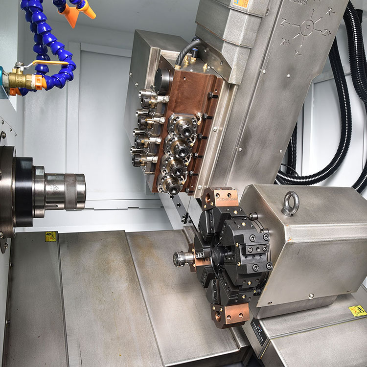 產(chǎn)品摘要:八工位(側向四工位+端向四工位)靜音強力型動(dòng)力頭,可在端面或側面進(jìn)行鉆、 銑、攻、雕等復雜加工,即可運行五軸聯(lián)動(dòng)的復雜加工程式,Y軸軌道采用線(xiàn)性導軌結構,電機與絲杠經(jīng)直