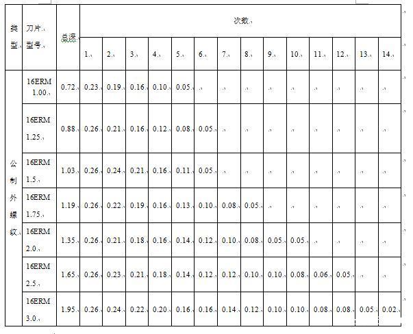 另外還有一個(gè)表格關(guān)于螺紋的牙深的就是總切削深度,加工螺紋時(shí),牙型不可能一刀車(chē)削完成,往往需要分好幾次切削,總的分配原則是,切削深度由大到小,可以根據下表