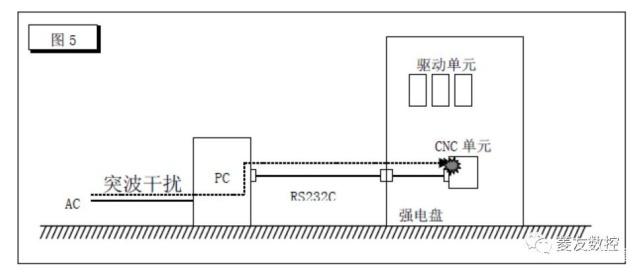 因為RS232C電纜線(xiàn)與CNC單元直接連接所以從PC進(jìn)入強大的突波干擾時(shí)CNC單元發(fā)生故障的可能性將提高。圖(5)
