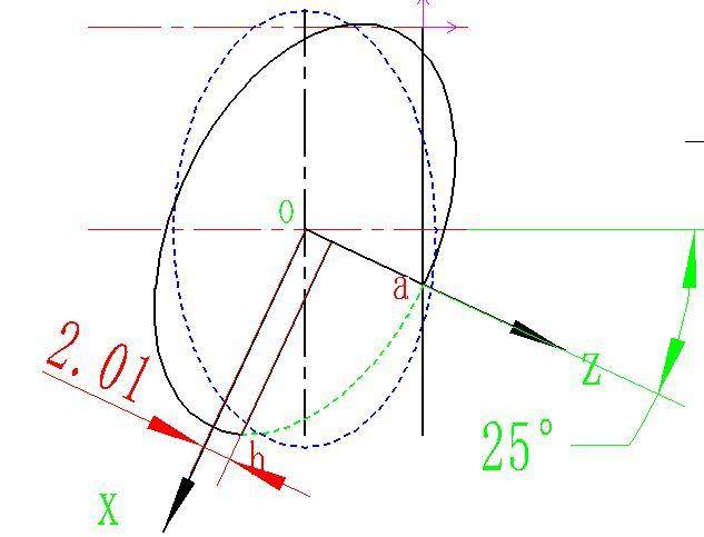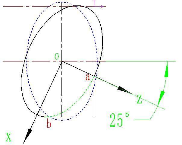 通常在數控車(chē)削中,我們通常把Z作為自變量,所以按照上面的公式我們只要找出被加工部分橢圓的起點(diǎn)和終點(diǎn)Z坐標即可,這個(gè)起點(diǎn)和終點(diǎn)坐標一定要是在未旋轉橢圓坐標系中的,所以按照旋轉的角度大家把坐標系建立一下,如下圖所示