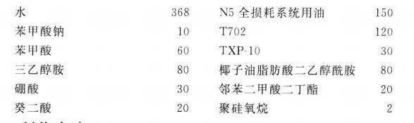 本品各組分質(zhì)量份配比范圍為:全損耗系統用油140160、石油磺酸鈉110130、酚醚磷酸酯2040、椰子油脂肪酸二乙醇酰胺7090、鄰苯二甲酸二丁酯1030、三乙醇胺7090、硼酸2040、癸二酸1030、苯甲酸鈉515、殺菌劑5070、水360380、消泡劑13。
