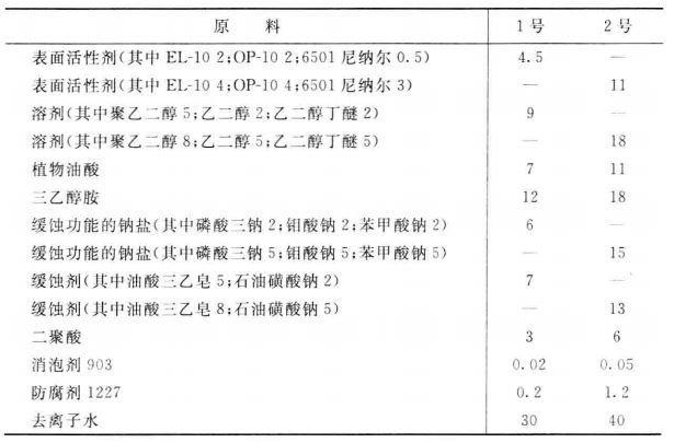 本品各組分質(zhì)量份配比范圍為:表面活性劑4.511、溶劑918、植物油酸711、三乙醇胺1218、緩蝕功能的鈉鹽615、緩蝕劑713、二聚酸36、消泡劑0.020.05、防腐劑0.21.2、去離子水3040。