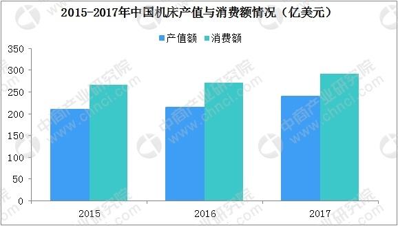 據數據統計,2015-2017年,我國機床市場(chǎng)消費總額分別為275億美元、275億美元、300億美元,我國機床產(chǎn)出總額分別為221億美元、229億美元、245億美元。經(jīng)歷了2016年機床市場(chǎng)企穩后,2017年國內機床行業(yè)受下游市場(chǎng)智能制造需求逐步向好。