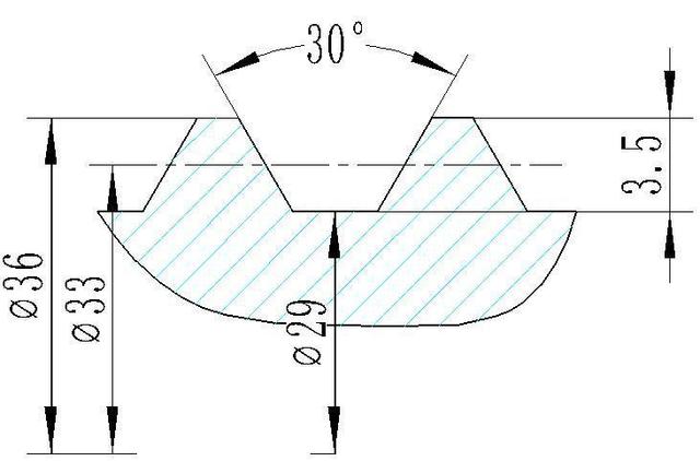 ;小徑 d3=d-2h3=29mm;牙高 h3=0.5P+ac=3.5mm;牙頂寬 f=0.366P=2.196mm;牙槽底寬